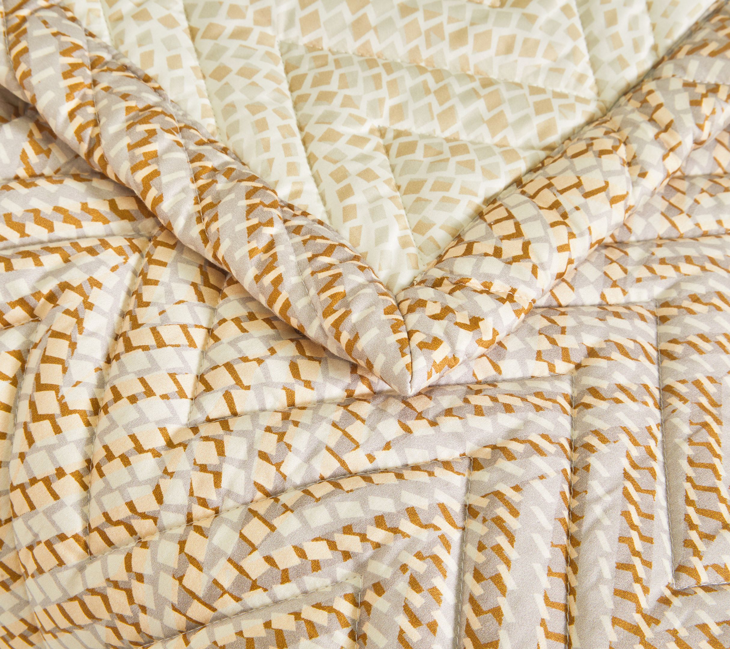 Couvre lit matelassé 250/250 cm Satin 100% coton peigné longues fibres 120 fils/cm² . La parure de lit Gravity séduit par son design moderne et sophistiqué. Ses motifs géométriques, subtilement déclinés en un dégradé de teintes, apportent une touche contemporaine à votre intérieur. Ses tonalités chaleureuses de sable, ocre et naturel, évoquent la douceur des paysages ensoleillés.