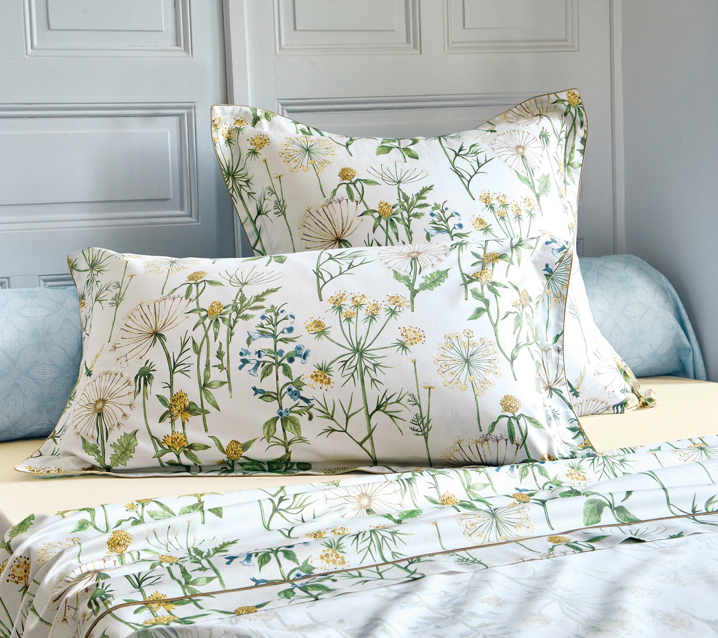 Issue du prestigieux univers de la maison anglaise SANDERSON, le linge de lit ANGELICA Tileul célèbre l’élégance intemporelle des jardins anglais. Son motif raffiné de fleurs et feuillages, décliné dans de subtiles nuances de bleu et de vert tilleul, apporte fraîcheur et douceur à la chambre, tout en créant une atmosphère apaisante et lumineuse.