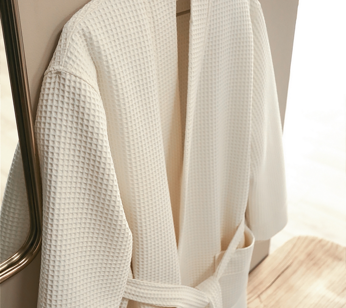Le peignoir MANOIR vous séduira de par son raffinement et la légèreté de la maille nid d'abeille.