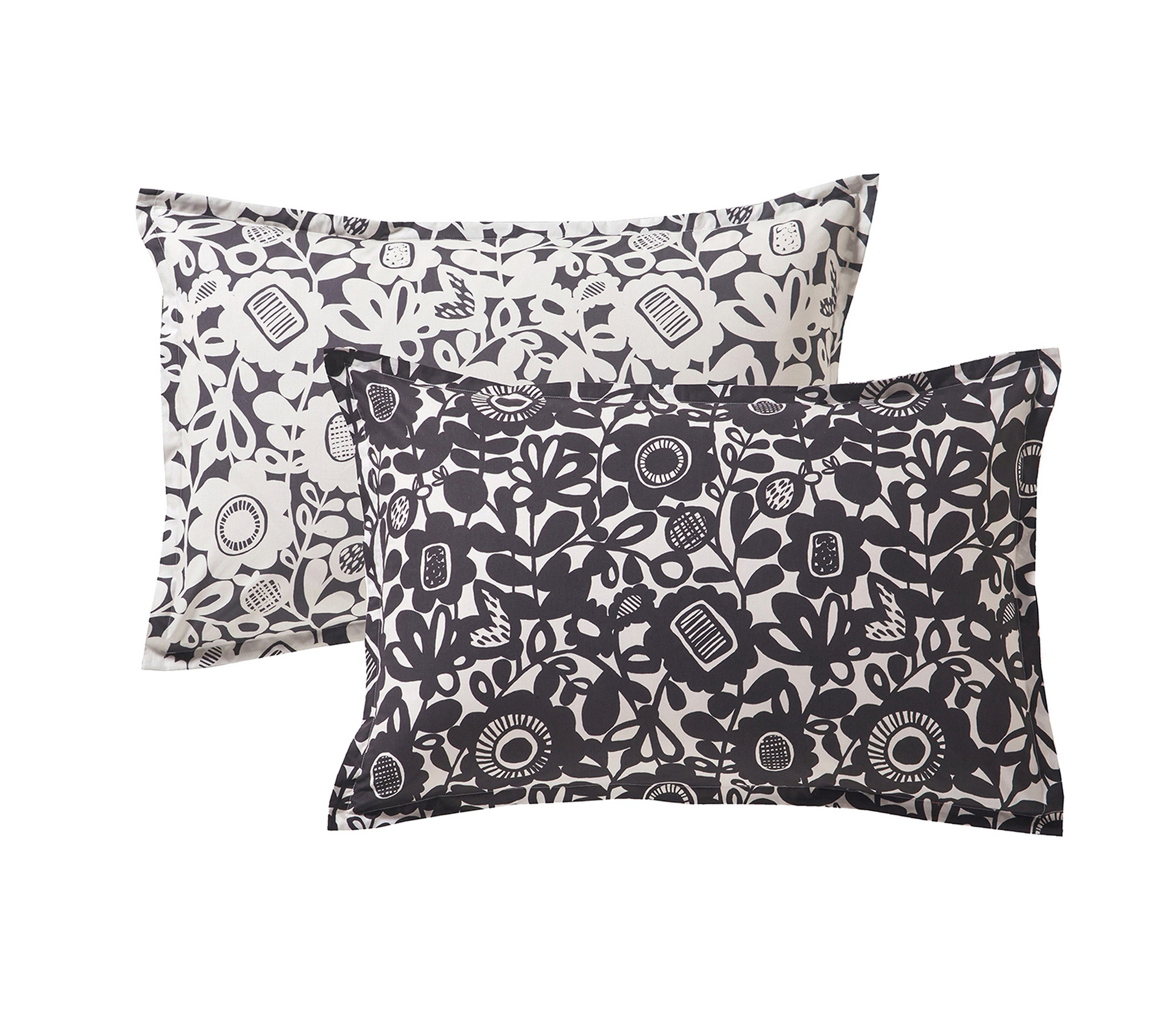 Taie 50/75 cm en percale 100% coton peigné 80 fils/cm² . La taie d'oreiller KUKKIA Graphite arbore un motif floral stylisé, à la fois moderne et intemporel. Le contraste des couleurs crée un effet visuel saisissant, pour une ambiance affirmée et élégante.