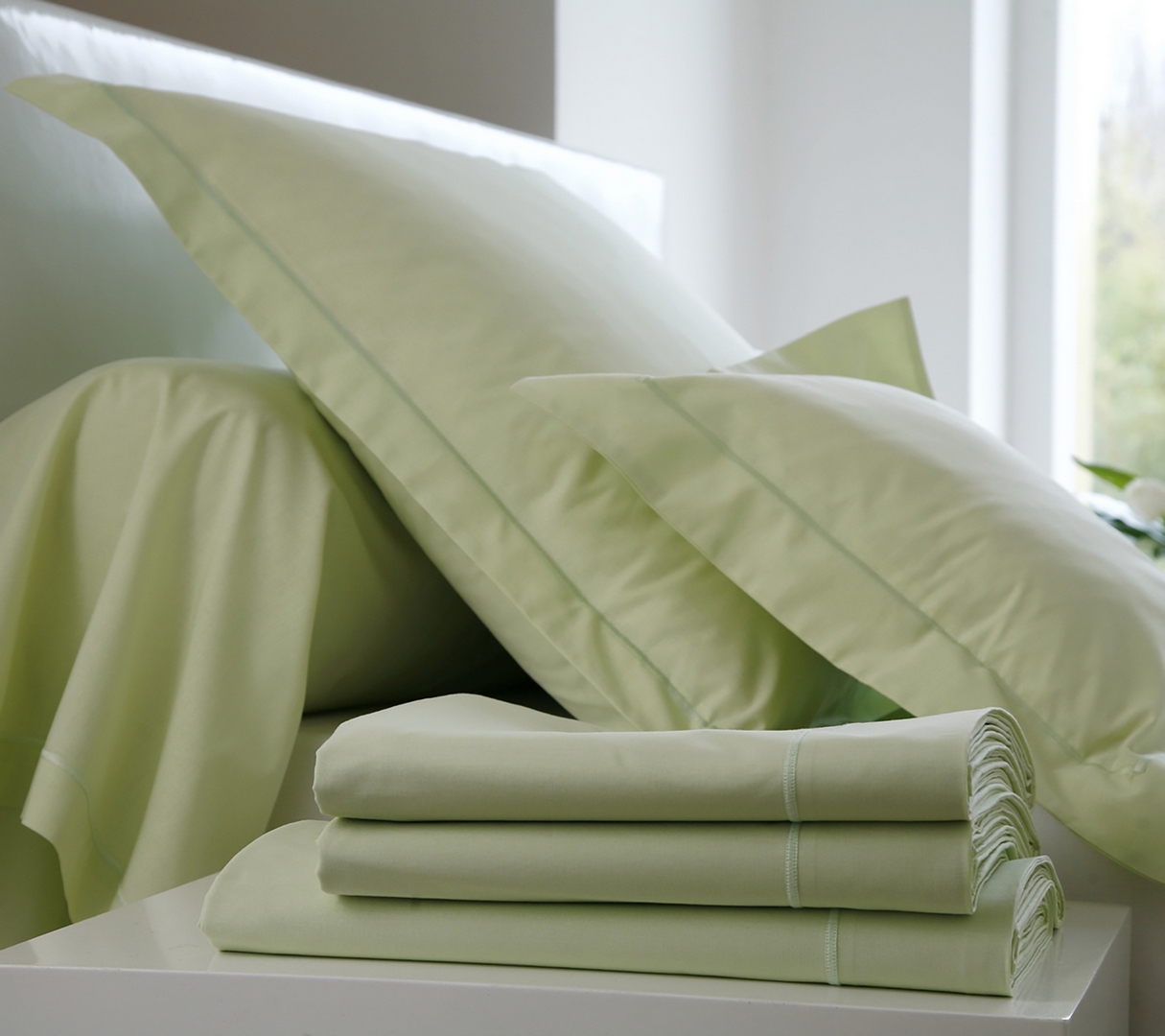 Teinte et fabriquée dans les Vosges, la taie d'oreiller est proposée avec un volant plat de 4 cm tout autour et une broderie bourdon ton sur ton.