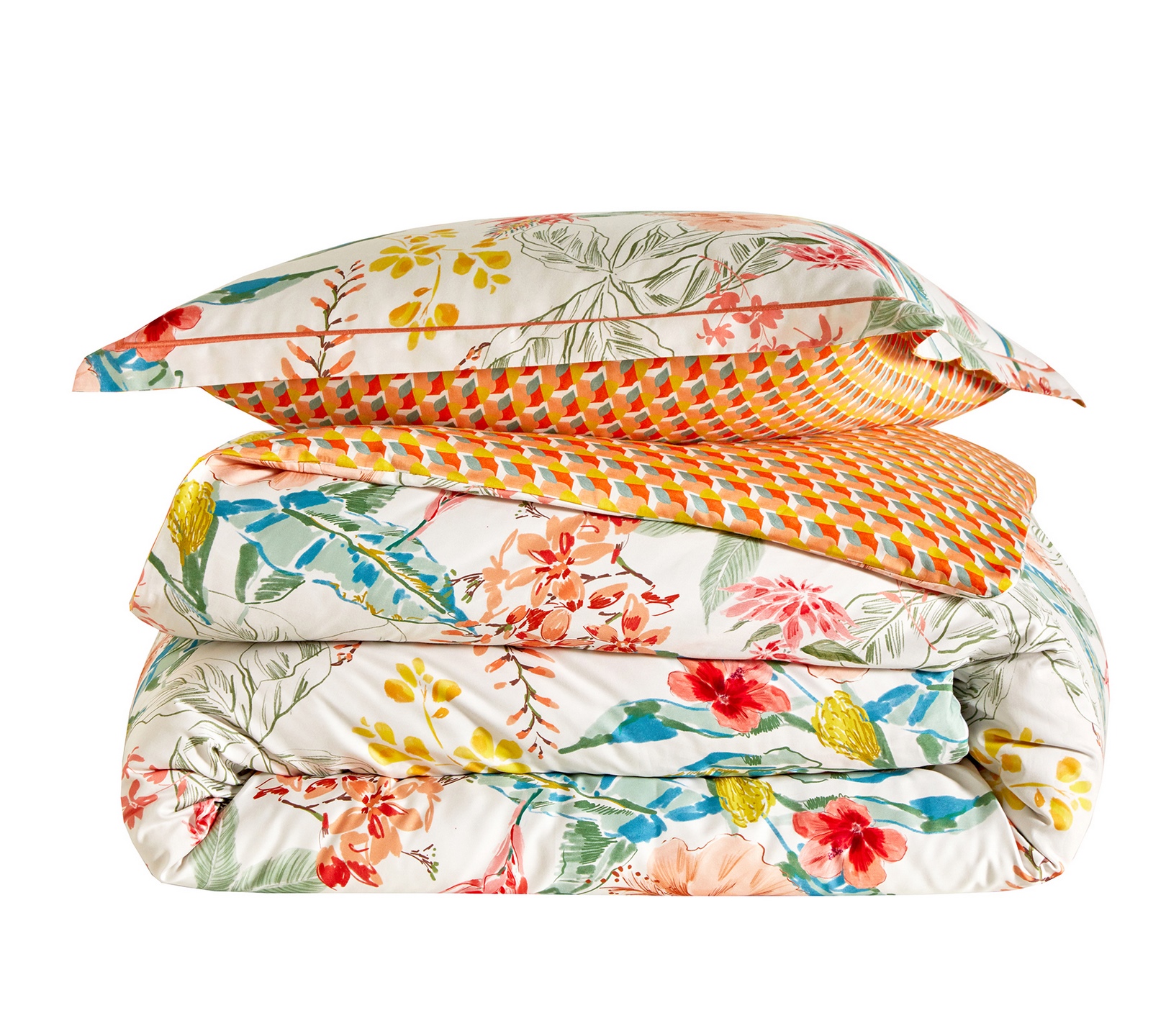 • Housse de couette : Face principale imprimée de fleurs exotiques et dos imprimé avec un jeu de motifs géométriques crayonnés, finition rabat cheminéee